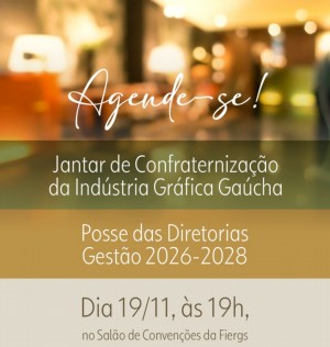 O Jantar de Confratenização da Indústria Gráfica Gaúcha acontecerá em 19/11, às 19 horas, no Salão de Convenções da Federação das Indústrias do Estado do Rio Grande do Sul (Fiergs), em Porto Alegre (Av. Assis Brasil, 8.787 – bairro Sarandi).
