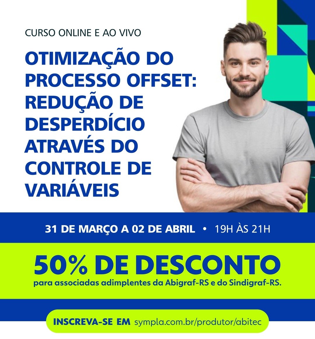 Para pagar a metade do valor indicado acima, associadas em dia com as entidades gráficas gaúchas devem solicitar o código promocional do curso desejado pelo e-mail comercial@abigraf-rs.com.br e aplicá-lo no momento da inscrição pelo Sympla. A cada dois cursos realizados, a empresa ganha uma inscrição gratuita em outra capacitação. Não perca!